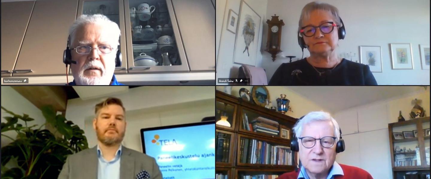 Kuvateksti: Webinaarin paneelikeskusteluun osallistuivat Eläkeläiset ry:n puheenjohtaja, Eläkeläisliittojen etujärjestö EETU ry:n tämänvuotinen puheenjohtaja Martti Korhonen (vasemmalla ylhäällä), Kansallinen Senioriliitto ry:n puheenjohtaja Anneli Taina ja Eläkkeensaajien Keskusliitto EKL:n puheenjohtaja, EETU:n varapuheenjohtaja Simo Paassilta. Vetäjänä toimi Telan yhteiskuntavaikuttamisen päällikkö Janne Pelkonen.