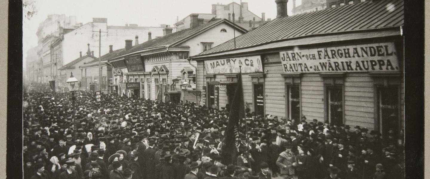 Kuvan tiedot: Äänioikeusmielenosoitus matkalla Rautatientorilta Senaatintorille. Kuvaaja Emil Rundman 1905. Museovirasto. ”Kun tieto oli levinnyt, että äänioikeusasia sinä päivänä tulisi kaikissa säädyissä käsittelynalaiseksi, kokoontuivat Helsingin työväestö ja raittiuskansa, joihin oli liittynyt paljon maaseuduilta saapuneita työläisiä, 14 p:n aamulla suurelle Rautatientorille, mistä soittokuntineen ja mielenosotuslippuineen lähtivät parinkymmenentuhannen hengen suuruisena kulkueena liikkeelle, kulkivat tervehtien ritarihuoneen ja säätytalon ohi, ja kokoontuivat sitten Senaatintorille, missä puheita pidettiin ja äänioikeusvaatimuksia esitettiin (Kyläkirjaston Kuvalehti, huhtikuu 1905).”