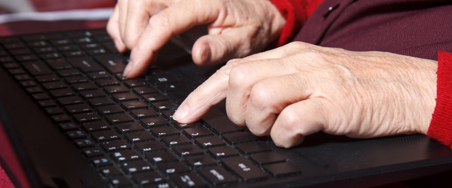 Vanhan naisen kädet tietokoneen näppäimistöllä