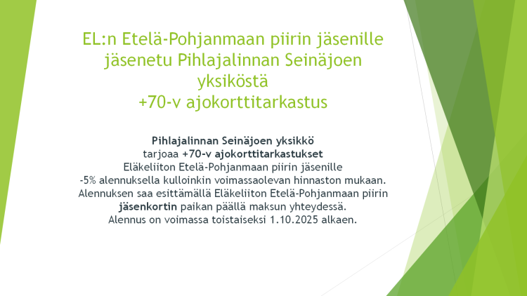 3. EL Etelä-Pohjanmaan piirin jäsenille JÄSENETU 70+ ajokorttitarkastukseen Pihlajalinnasta, Seinäjoen yksiköstä