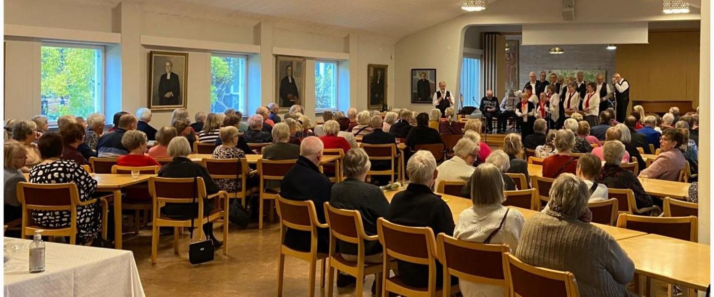 Eläkeliitto Lohjan yhdistyksen Lauluryhmä Päikkäri esiitymässä Seniorifoorumissa Lohjan seurakuntatalolla. Petra Lindeberg oli puhumassa edunvalvonnasta ja testamentista, alasivulla linkki.