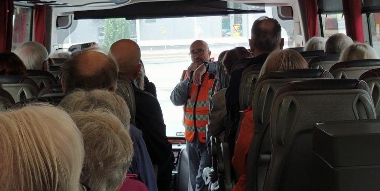 Lähes täysi bussilasti lähti kohti Kokkolaa, Sari toivotti kaikki tervetulleiksi ansaitulle matkalle ja kertoi päivän ohjelmasta:
