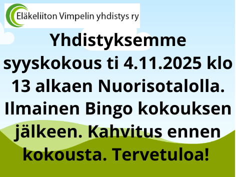 Yhdistyksemme syyskokous ti 4.11.2025 klo 13 alkaen Nuorisotalolla. Ilmainen bingo kokouksen jälkeen. Kahvitus ennen kokousta.