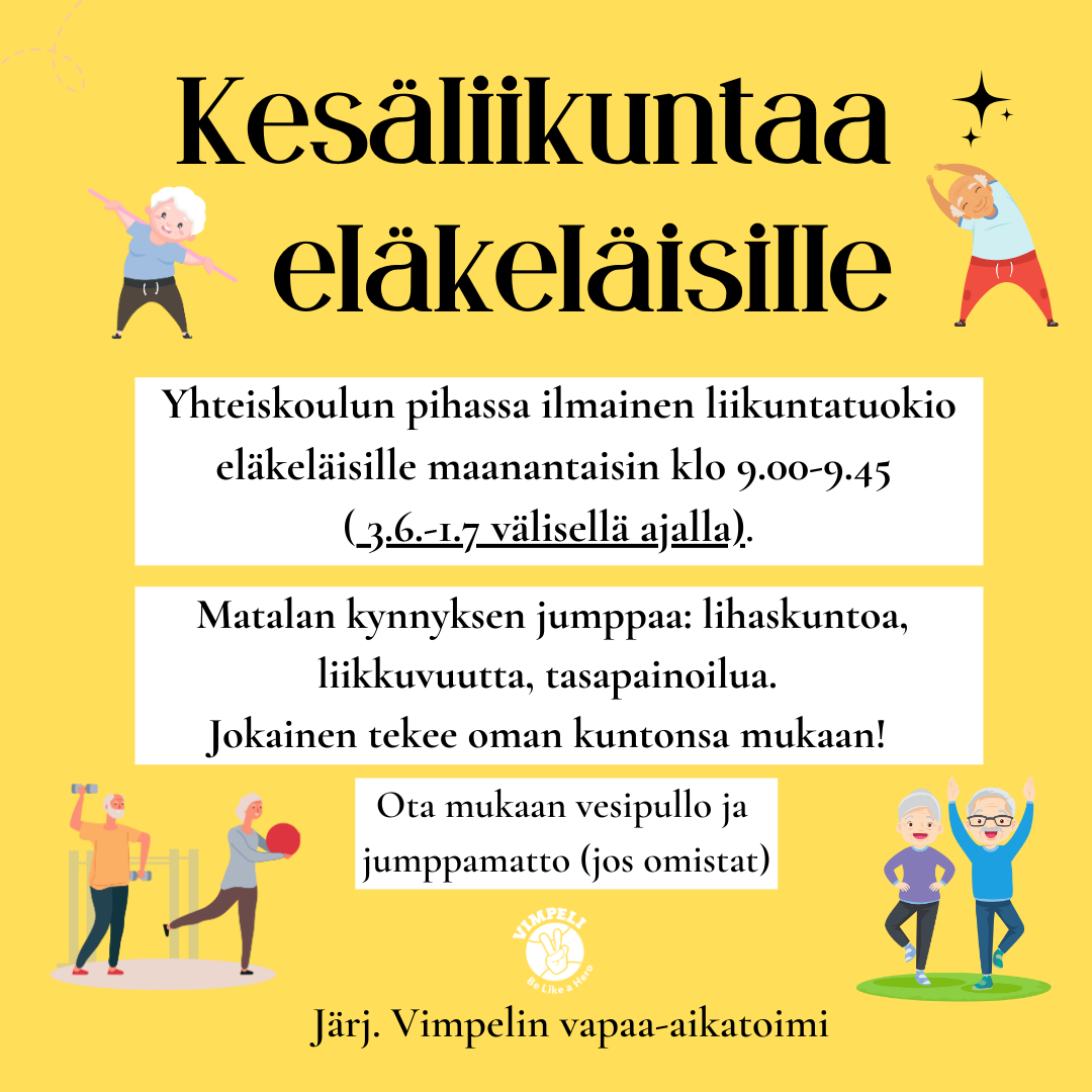 - Vimpelin kunta, Vimpelin vapaa-aikatoimi ja Eläkeliiton Vimpelin yhdistys järjestää kesäistä puuhaa kaikenikäisille 24.-27.7. Ilmaisia jumppatuokioita alkuviikosta Saarikentällä: maanantaina klo 11.00 lihaskuntojumppa 45 min, tiistaina klo 11.00 tanssillinen jumppa 30 min ja keskiviikkona klo 10.00 kehonhuolto 30 min. Oma jumppa-alusta mukaan. Säävaraus!!