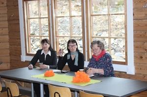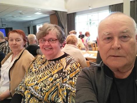 15.4.2025 Eläkeliiton E-P:n piirin kevätkokouksessa Lapualla. Vuokko Pajala, Sirkka Ahvenkoski ja Seppo Kataja