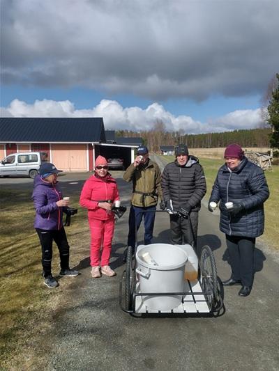 Sää ei suosinut hiihtämistä. Mukana oli kuitenkin 22 henkeä. Juttua riitti ja kuviakin huomasimme ottaa vasta ihan lopussa yhden kappaleen. Martti ja Marjatta Hotakainen nauttivat makkarasta ja mehusta hiihtolenkin jälkeen.