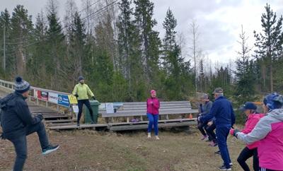 -Osana Vimpelin kunnan Unelmien liikuntapäivää Eläkeliiton Vimpelin yhdistys järjesti lauantaina 10.5. porraskävelytapahtuman Lakiksen kuntoportailla. Mukana oli 11 yhdistyksemme jäsentä. Kuva Vuokko Rankilan johtamasta alkuverryttelystä.