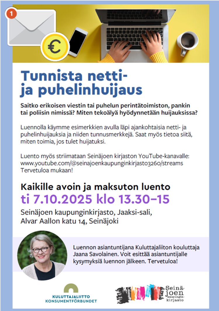 -Lokakuun kahvikerho Nuorisotalolla ti 7.10. Kahvitus klo 12 alkaen, klo 12.30-13.30 MikäDigi hankkeesta Rami Riutta tulee opastamaan tietokoneen käyttöä (ota oma laite mukaan). Tunnista netti- ja puhelinhuijaus luento Kuluttajaliiton esityksenä 13.30-15